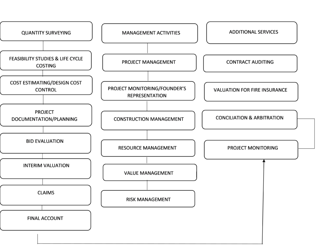 These include responsibilities in connection with programmes or time managements; advising on Contractual procedure and project information; preparation of bidding and control documents, (including bills of Quantities), advising on tendering methods and the choice and methods of employing consultants and contractors.